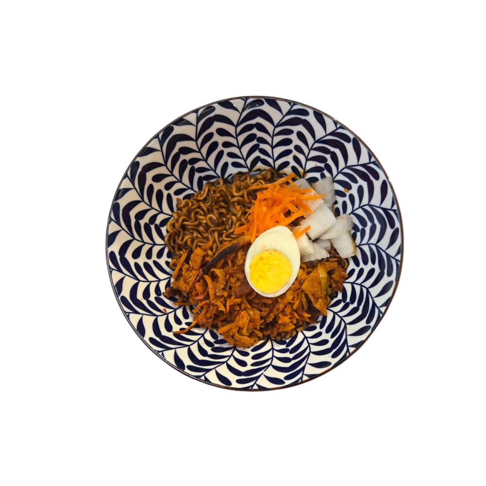 Ramen estilo jjajang lleno de sabor, preparado con carne de cerdo sabrosa y vegetales frescos en abundancia. Lo hicimos aún más delicioso agregando chile para un toque picante. Se entrega con kimchi tradicional coreano