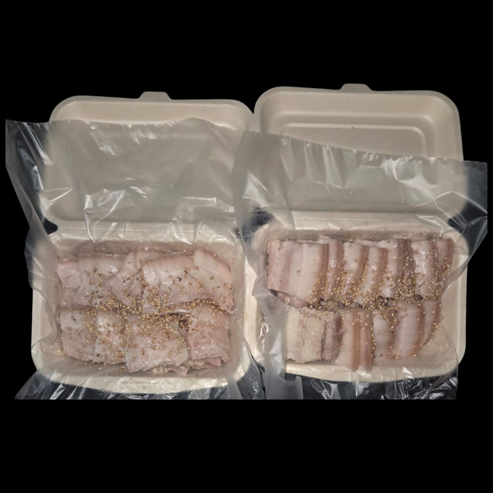 삼겹살 1kg, 생굴 200g 이상, 무김치, 보쌈김치, 쌈야채, 고추, 마늘 기름장, 쌈장으로 구성