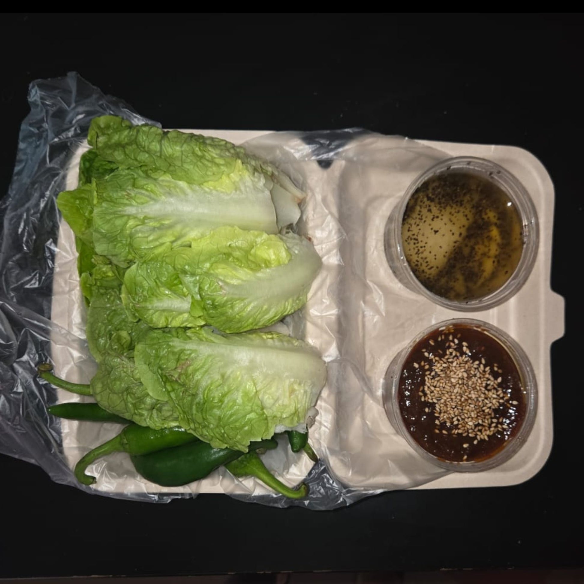 vegetales para envolver, chile, ajo, aceite con sal y pasta ssamjang.