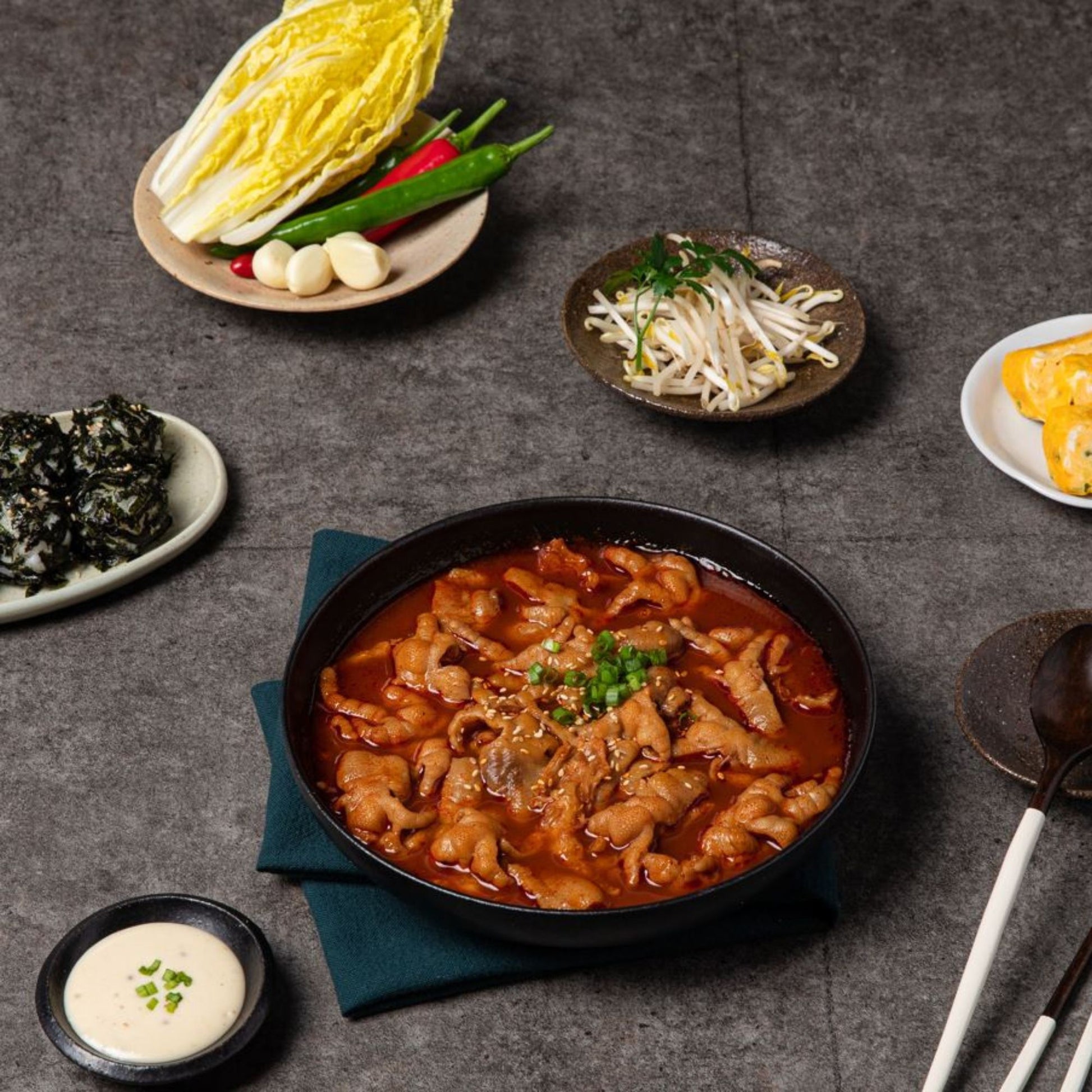 매콤한 양념 국물에 푹 졸여낸 닭발. 불향과 진한 양념 맛이 특징이에요. 뼈 있는 닭발 또는 무뼈 닭발로 선택 가능하기도 합니다. -