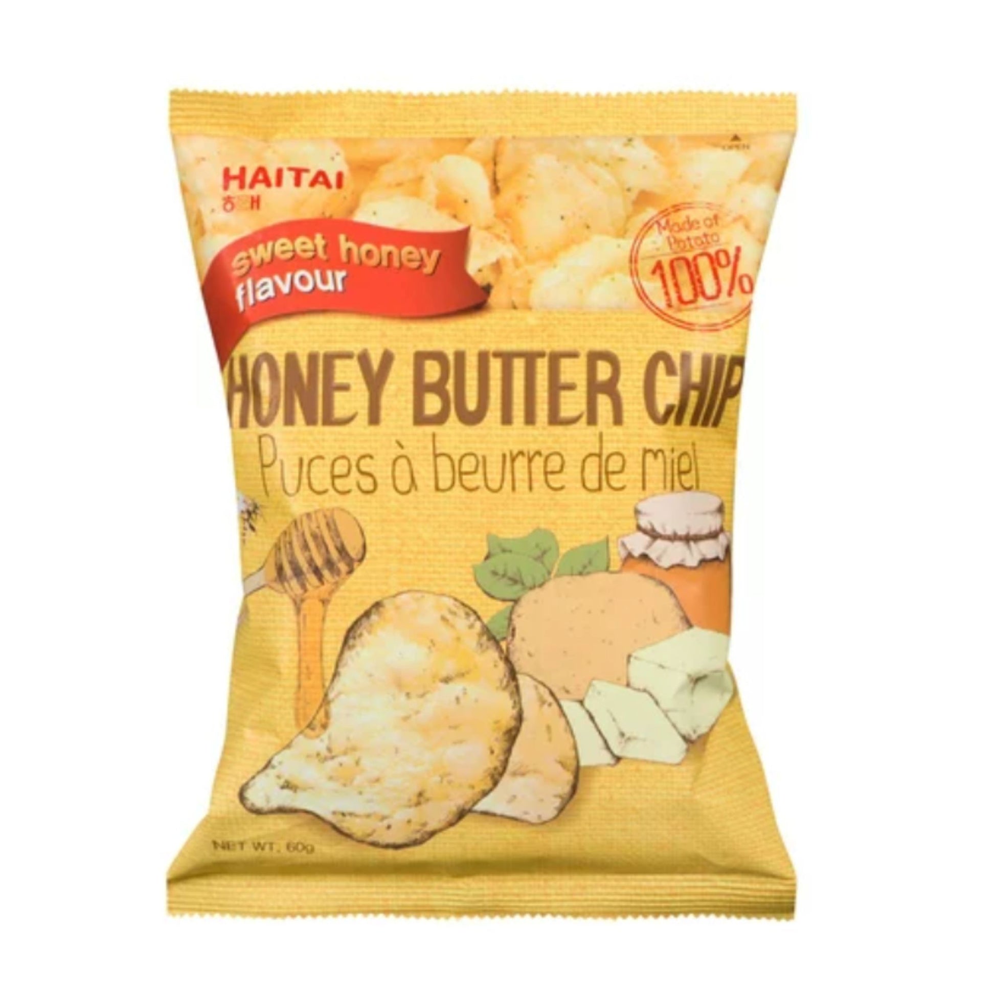 Haitai Honey Butter Chip 60g es un snack premium hecho con papas crujientes fritas, mantequilla francesa “gourmet” y miel de acacia.