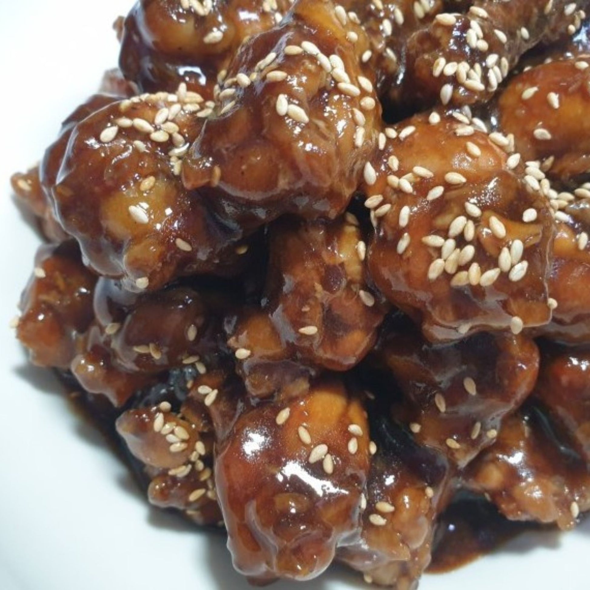 Disfrute de un sabroso dakgangjeong: pollo frito sin hueso y crujiente, cubierto con una deliciosa salsa Teriyaki.